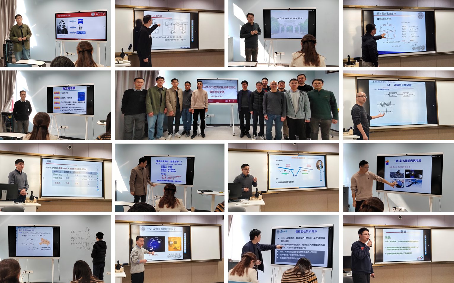 竞赛活动受到了学院领导和教师的高度重视和大力支持,学院党委书记龚呈卉、副院长陈煜以及党委副书记、副院长黄冠平莅临比赛现场观摩指导,东吴学院副院长江美福教授、医学部公共卫生学院副院长张洁教授、学院本科生教学督导吴建宏教授、光电信息系副主任秦琳玲副教授、学院研究生教学督导袁孝教授、陶智教授、延英教授应邀担任点评嘉宾。本次教学竞赛共计14位青年教师参加。